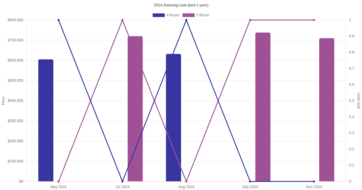 Below is a quick summary of the resale transactions volume and average price trends for the 4 room and 5 room units at 231A Sumang Lane.