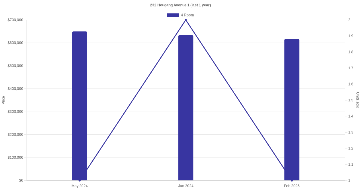 Below is a quick summary of the resale transactions volume and average price trends for the 4 room units at 232 Hougang Avenue 1.