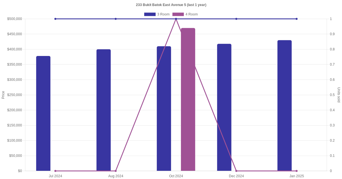 Below is a quick summary of the resale transactions volume and average price trends for the 3 room and 4 room units at 233 Bukit Batok East Avenue 5.