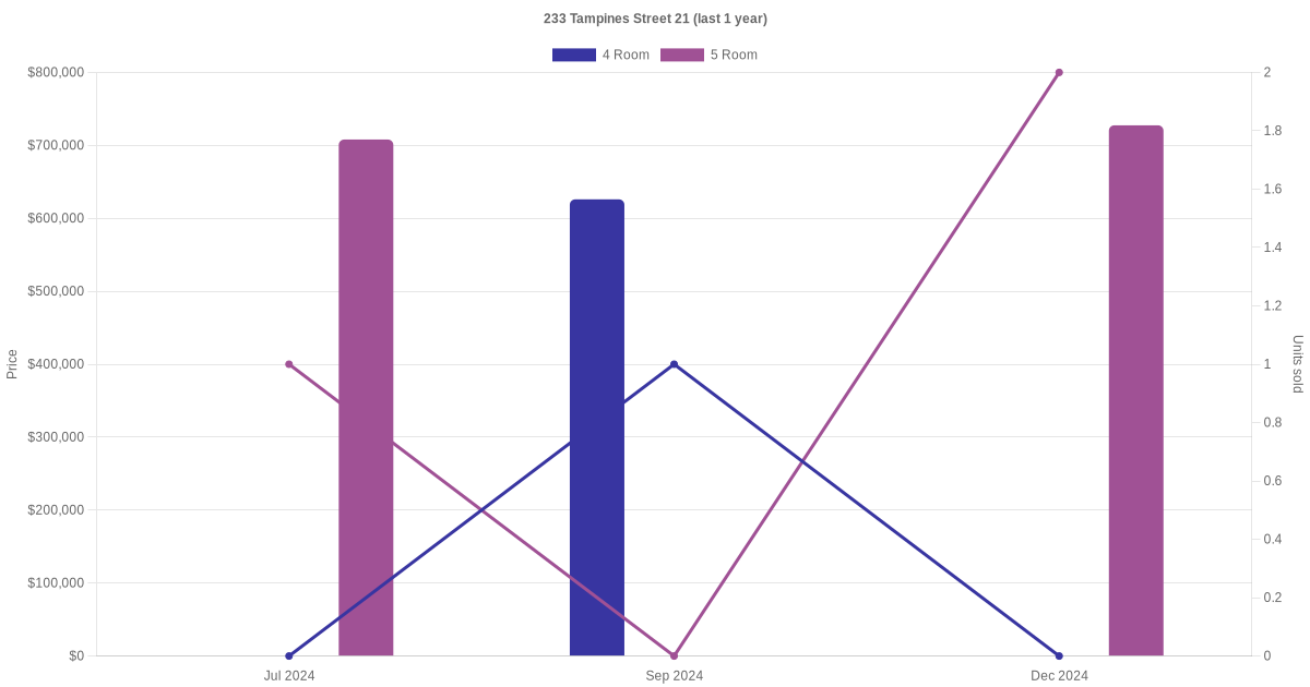 Below is a quick summary of the resale transactions volume and average price trends for the 4 room and 5 room units at 233 Tampines Street 21.