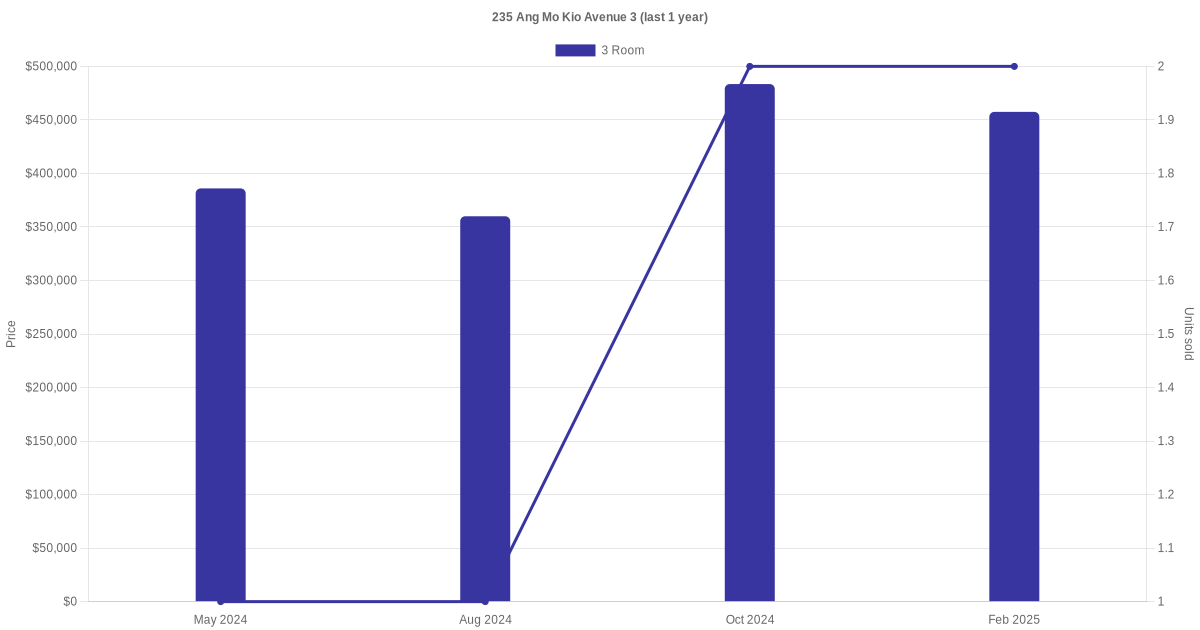 Below is a quick summary of the resale transactions volume and average price trends for the 3 room units at 235 Ang Mo Kio Avenue 3.