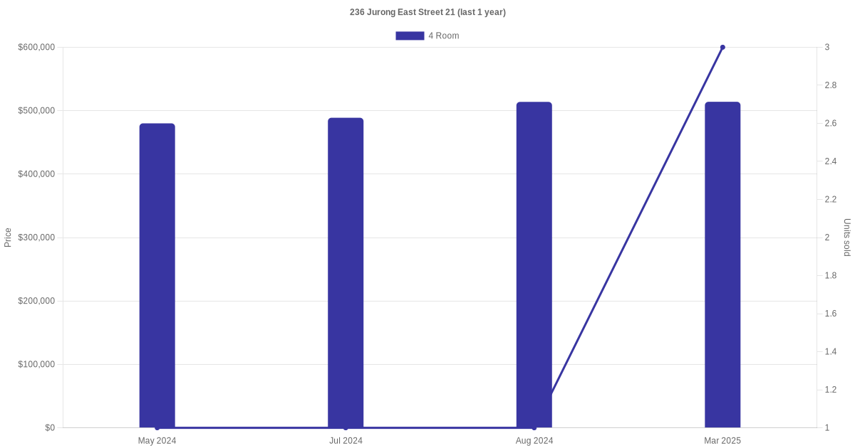 Below is a quick summary of the resale transactions volume and average price trends for the 4 room units at 236 Jurong East Street 21.