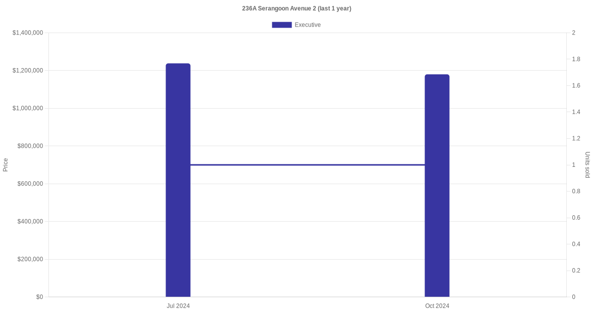 Below is a quick summary of the resale transactions volume and average price trends for the executive units at 236A Serangoon Avenue 2.