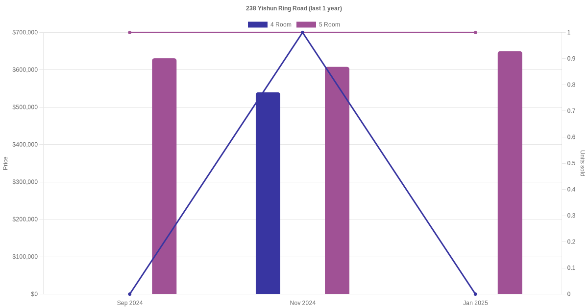 Below is a quick summary of the resale transactions volume and average price trends for the 4 room and 5 room units at 238 Yishun Ring Road.