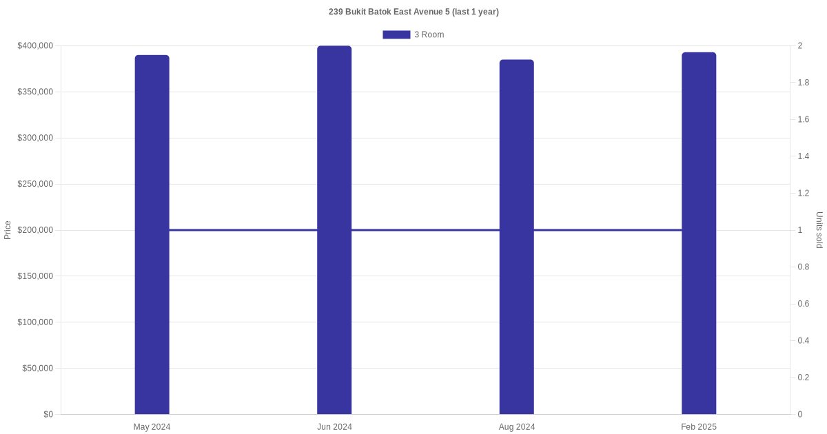 Below is a quick summary of the resale transactions volume and average price trends for the 3 room and 4 room units at 239 Bukit Batok East Avenue 5.