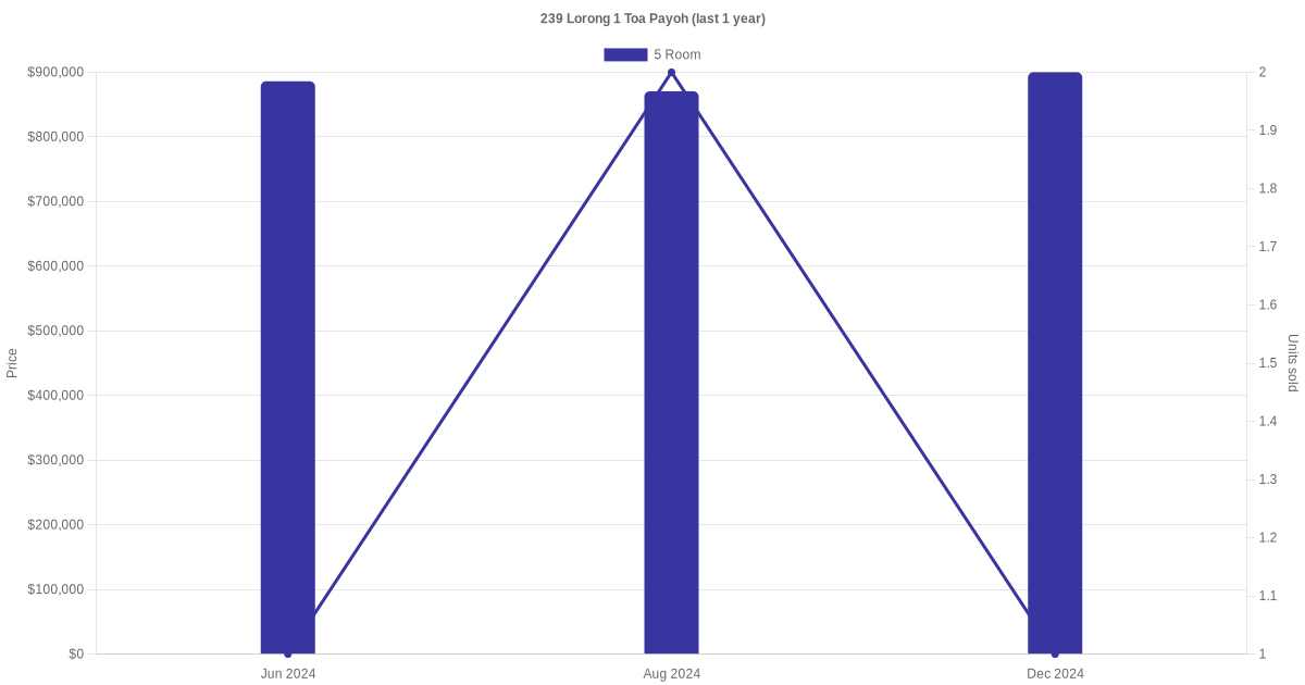 Below is a quick summary of the resale transactions volume and average price trends for the 4 room and 5 room units at 239 Lorong 1 Toa Payoh.