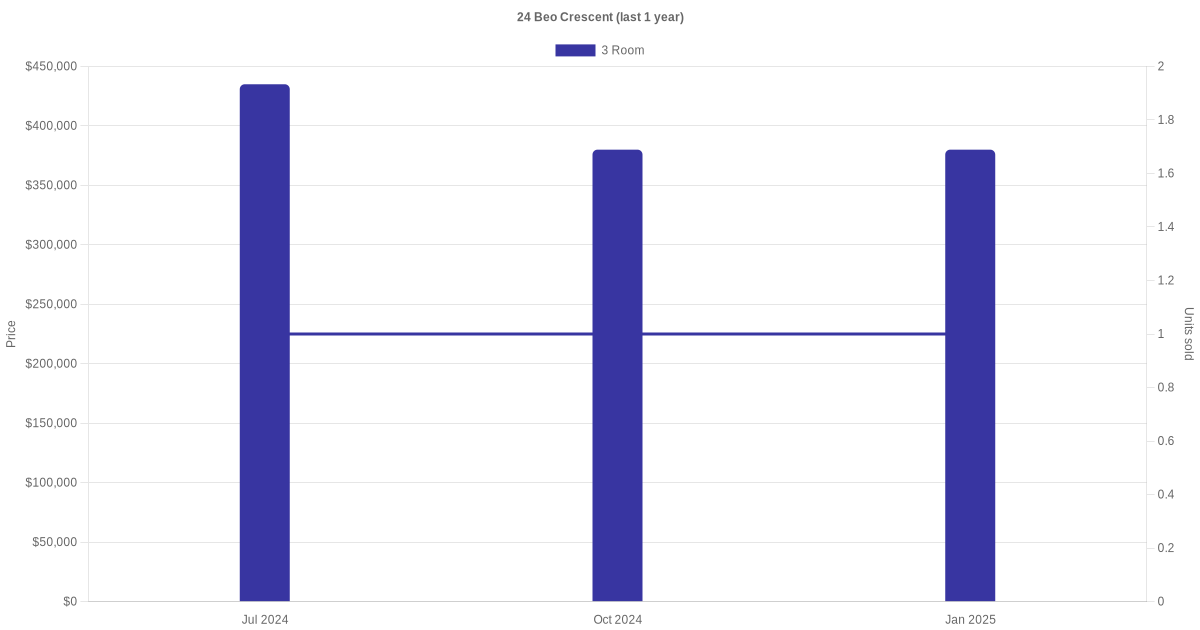 Below is a quick summary of the resale transactions volume and average price trends for the 2 room and 3 room units at 24 Beo Crescent.