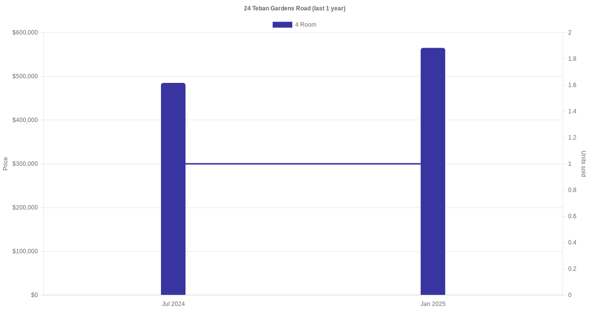 Below is a quick summary of the resale transactions volume and average price trends for the 4 room units at 24 Teban Gardens Road.