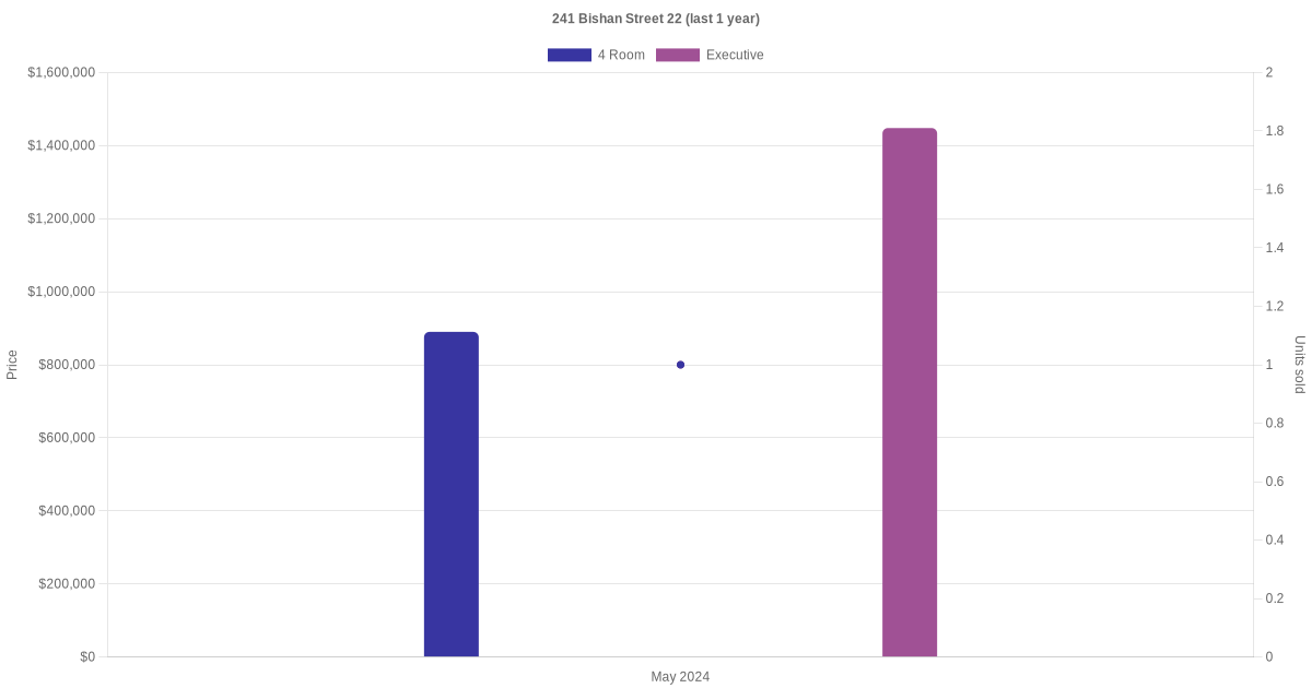 Below is a quick summary of the resale transactions volume and average price trends for the 4 room, 5 room and executive units at 241 Bishan Street 22.