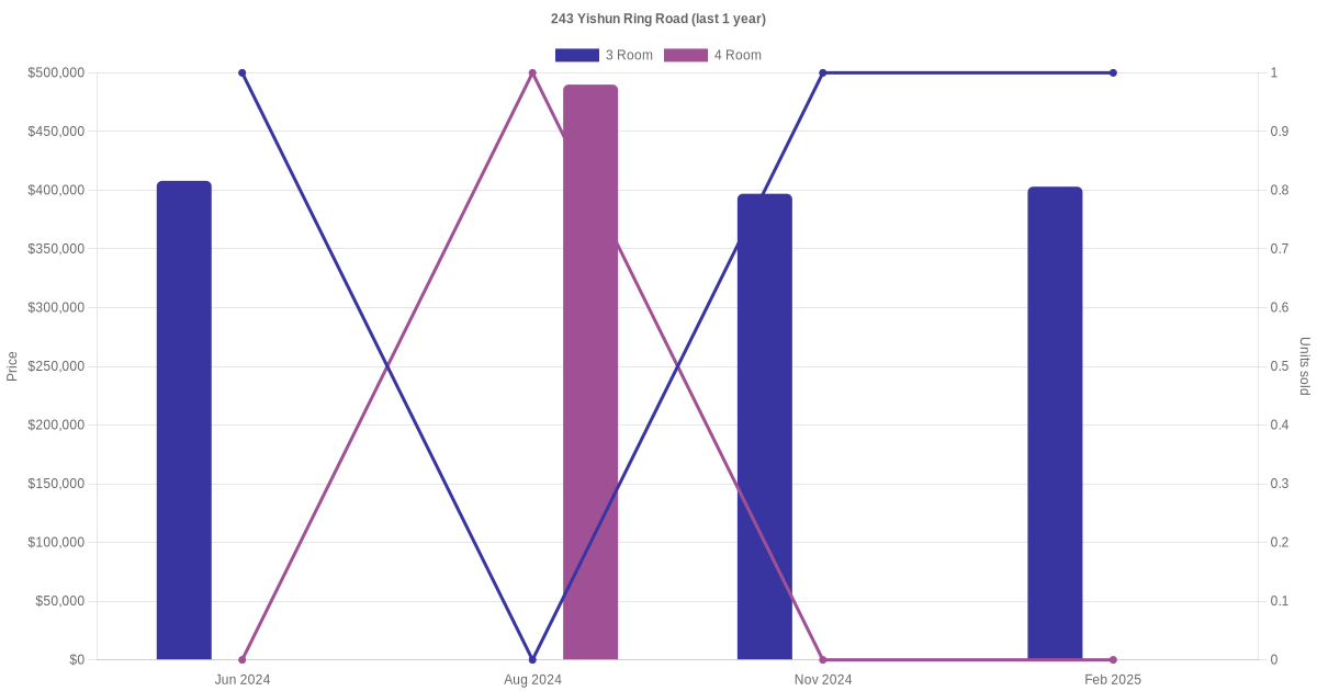Below is a quick summary of the resale transactions volume and average price trends for the 3 room and 4 room units at 243 Yishun Ring Road.