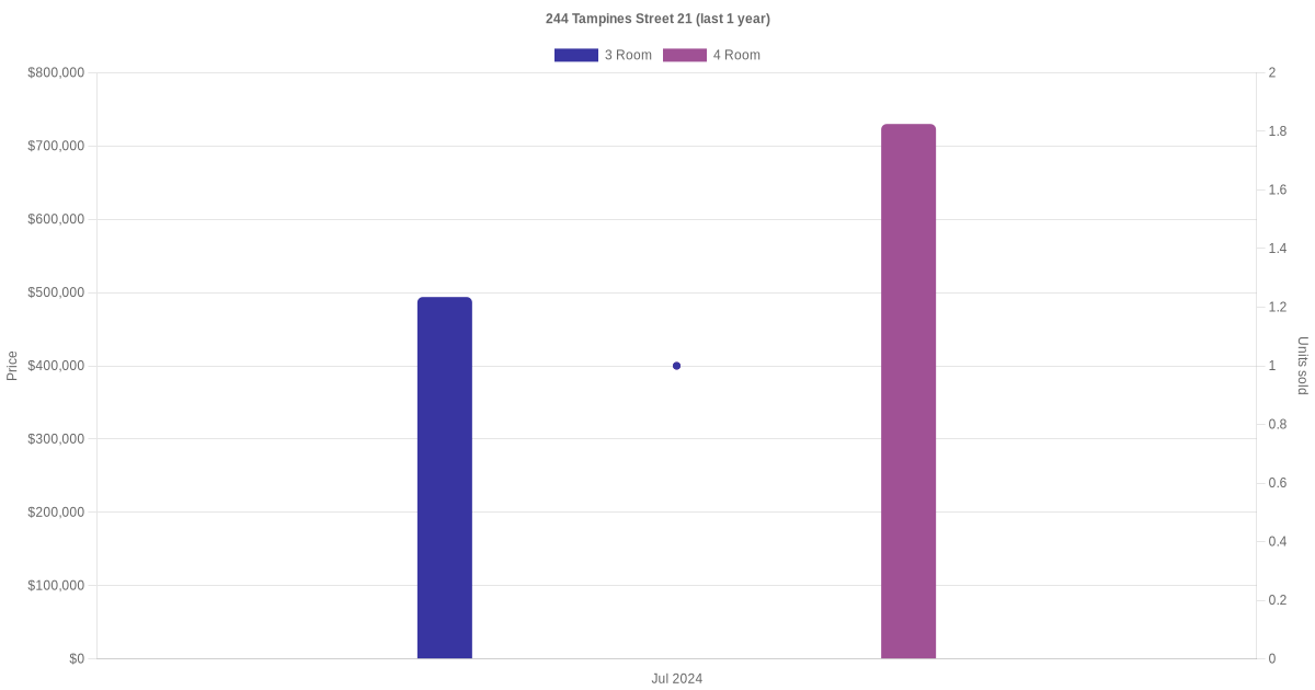 Below is a quick summary of the resale transactions volume and average price trends for the 3 room and 4 room units at 244 Tampines Street 21.