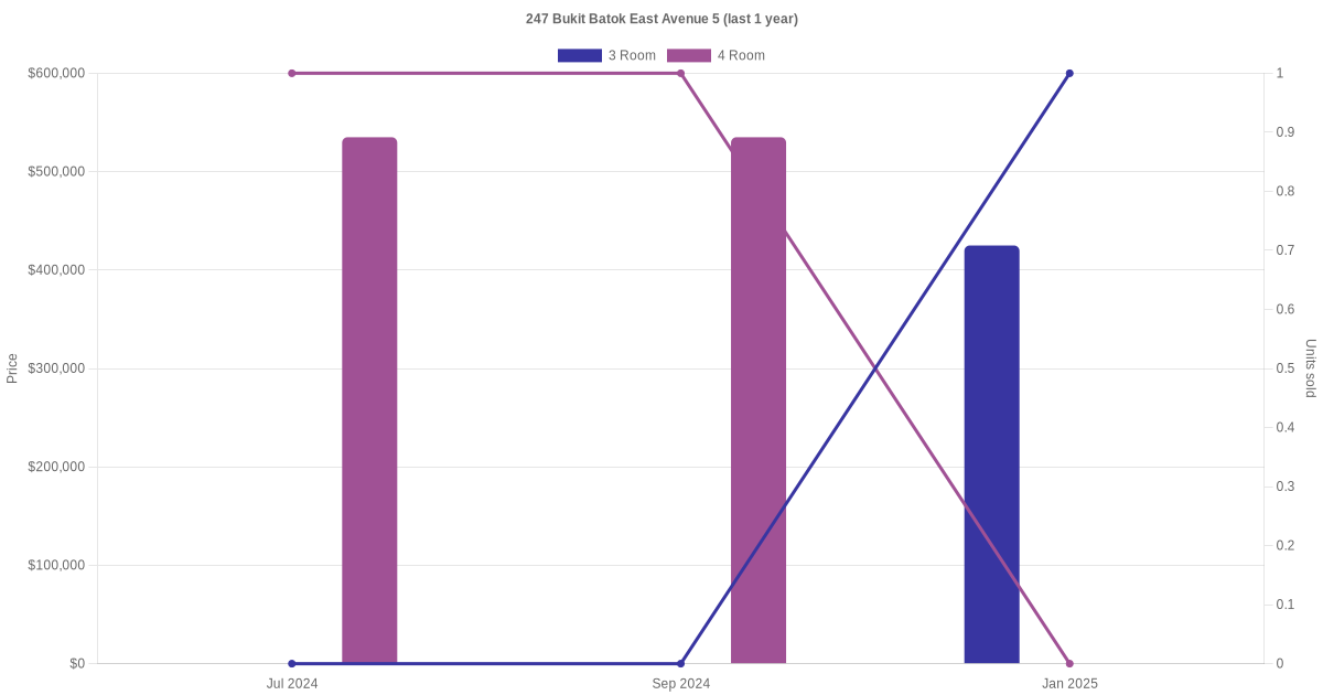 Below is a quick summary of the resale transactions volume and average price trends for the 3 room and 4 room units at 247 Bukit Batok East Avenue 5.