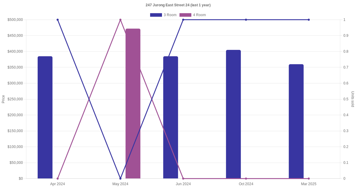 Below is a quick summary of the resale transactions volume and average price trends for the 3 room and 4 room units at 247 Jurong East Street 24.