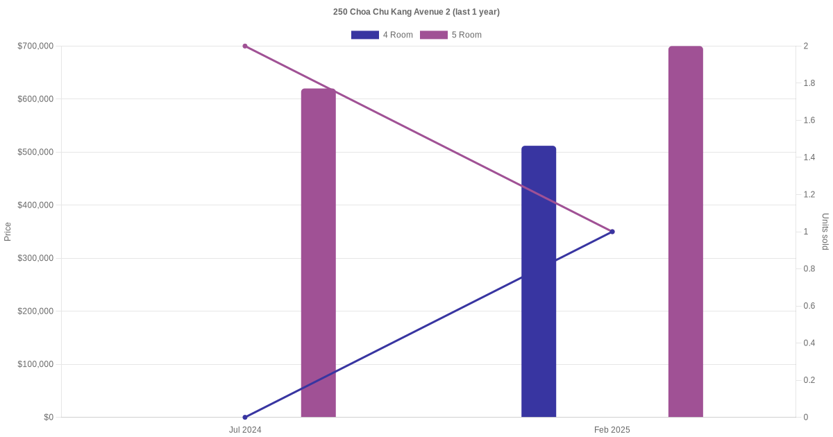 Below is a quick summary of the resale transactions volume and average price trends for the 4 room and 5 room units at 250 Choa Chu Kang Avenue 2.