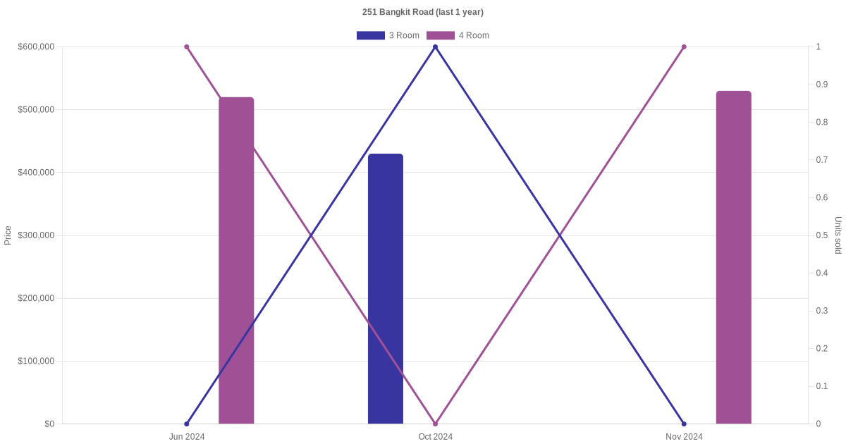 Below is a quick summary of the resale transactions volume and average price trends for the 3 room and 4 room units at 251 Bangkit Road.