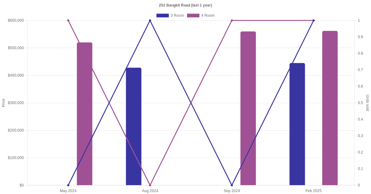 Below is a quick summary of the resale transactions volume and average price trends for the 3 room and 4 room units at 252 Bangkit Road.