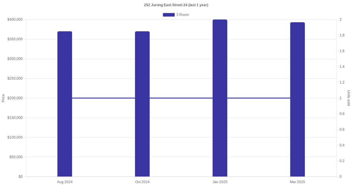 Below is a quick summary of the resale transactions volume and average price trends for the 3 room units at 252 Jurong East Street 24.