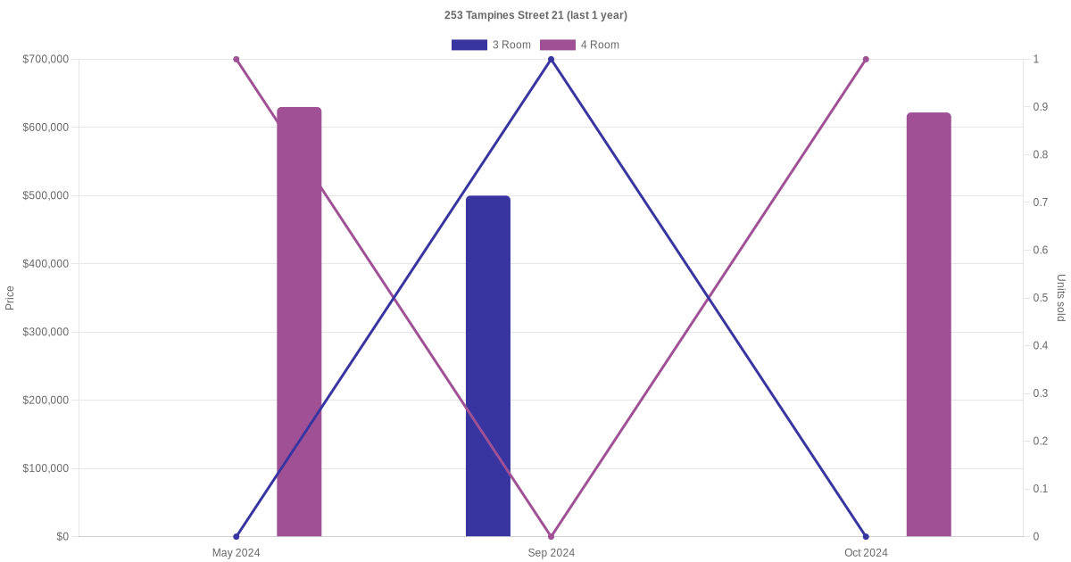 Below is a quick summary of the resale transactions volume and average price trends for the 3 room and 4 room units at 253 Tampines Street 21.