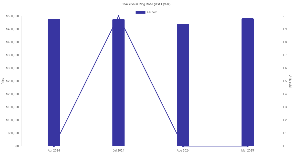 Below is a quick summary of the resale transactions volume and average price trends for the 4 room units at 254 Yishun Ring Road.