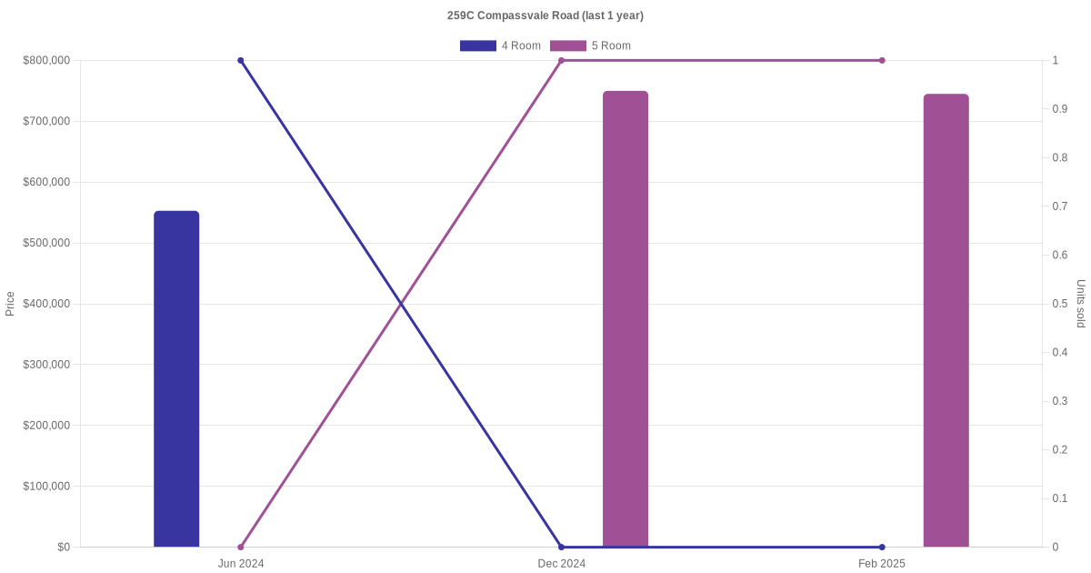 Below is a quick summary of the resale transactions volume and average price trends for the 4 room and 5 room units at 259C Compassvale Road.