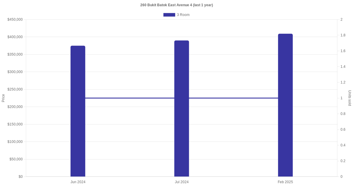 Below is a quick summary of the resale transactions volume and average price trends for the 3 room and 4 room units at 260 Bukit Batok East Avenue 4.