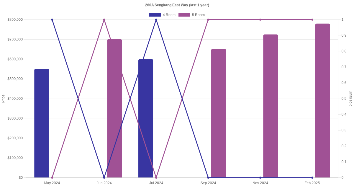 Below is a quick summary of the resale transactions volume and average price trends for the 4 room and 5 room units at 260A Sengkang East Way.