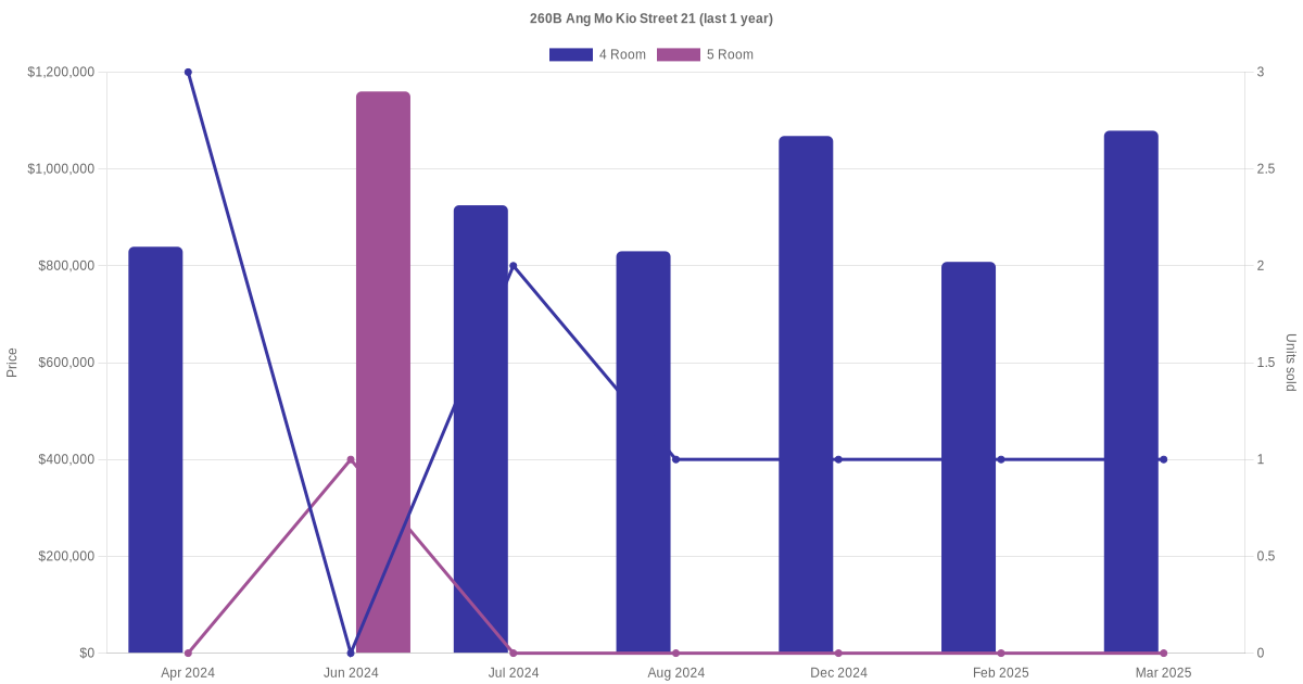 Below is a quick summary of the resale transactions volume and average price trends for the 4 room and 5 room units at 260B Ang Mo Kio Street 21.