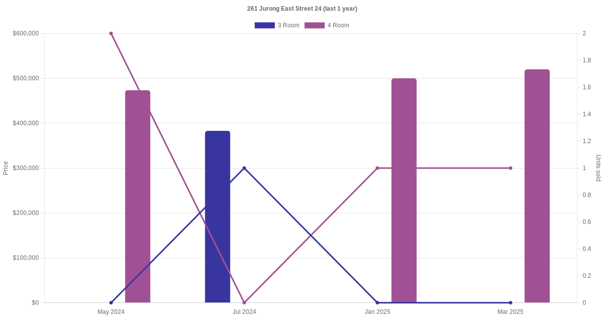 Below is a quick summary of the resale transactions volume and average price trends for the 3 room and 4 room units at 261 Jurong East Street 24.