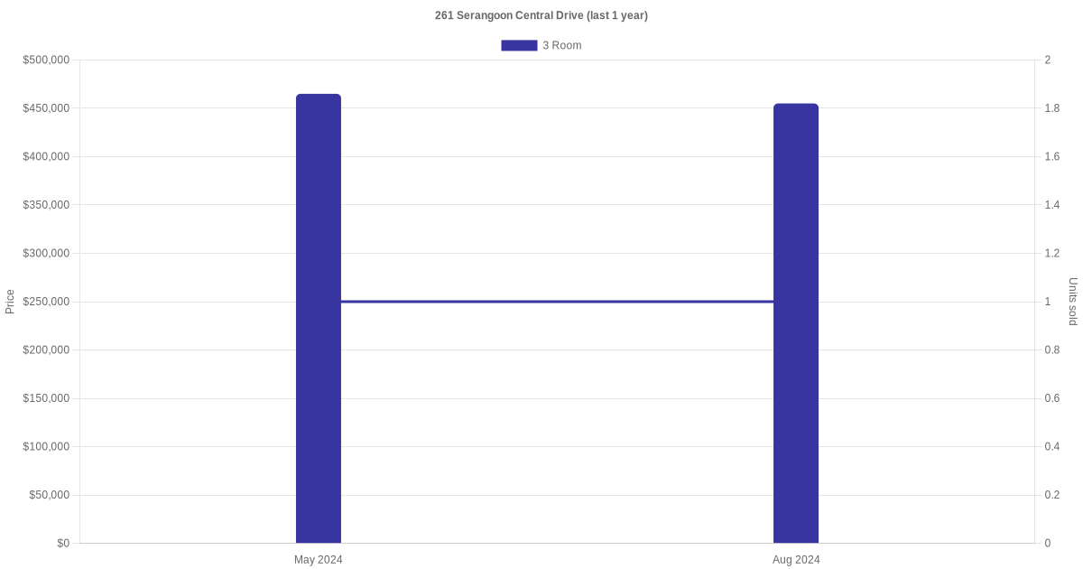 Below is a quick summary of the resale transactions volume and average price trends for the 3 room units at 261 Serangoon Central Drive.