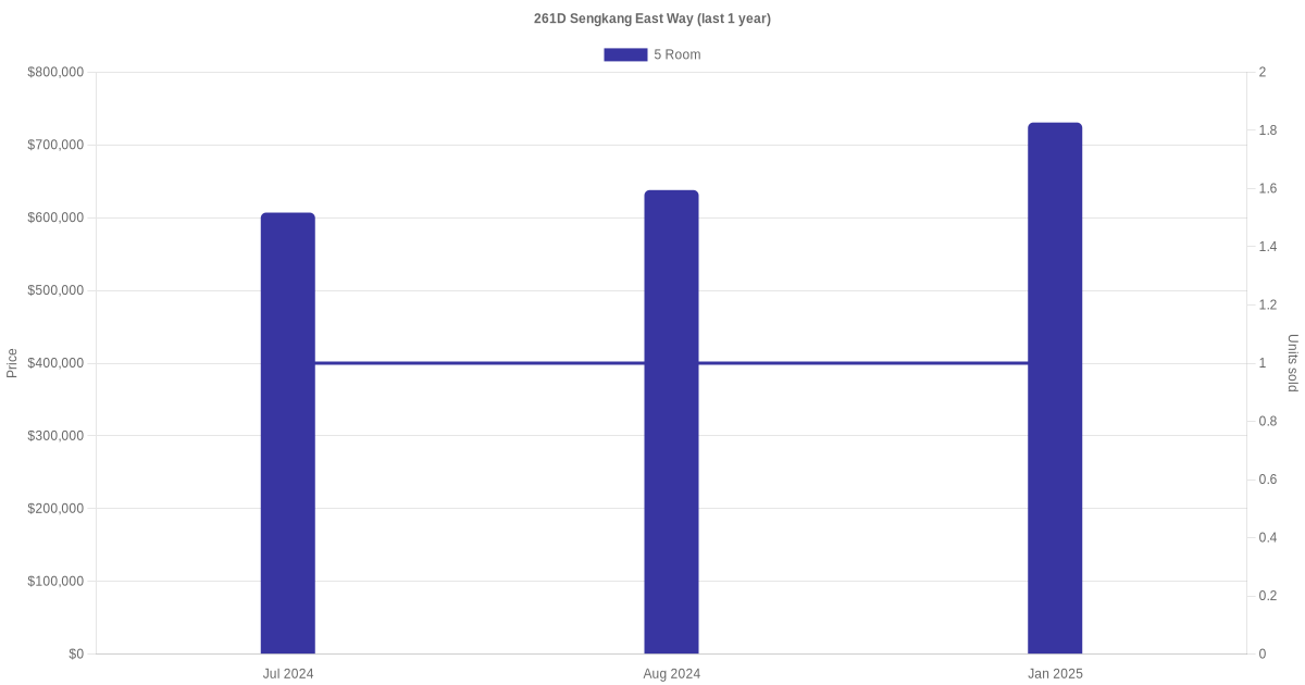 Below is a quick summary of the resale transactions volume and average price trends for the 5 room units at 261D Sengkang East Way.