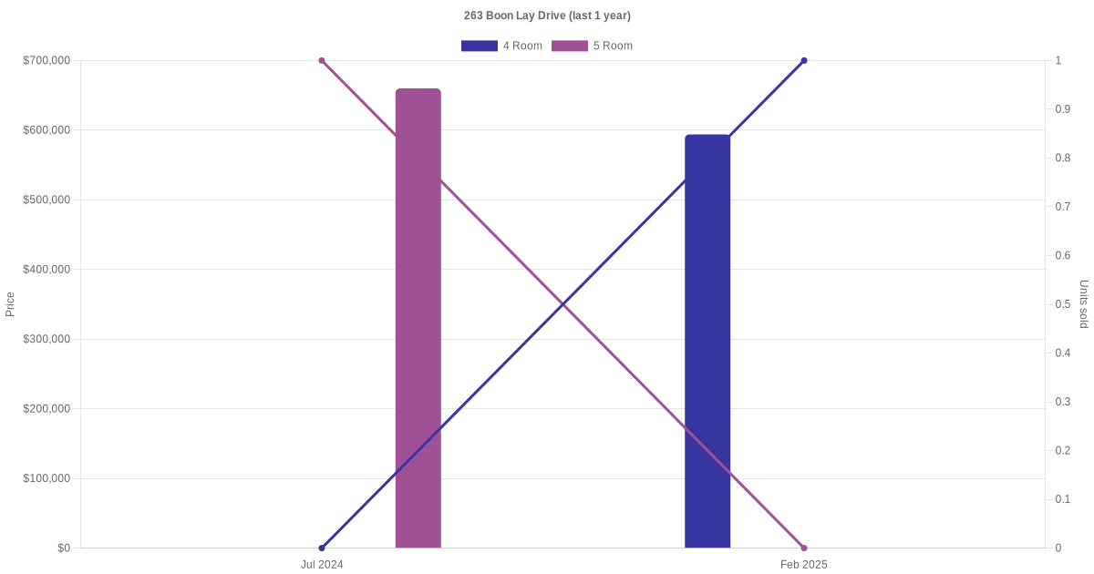 Below is a quick summary of the resale transactions volume and average price trends for the 4 room and 5 room units at 263 Boon Lay Drive.