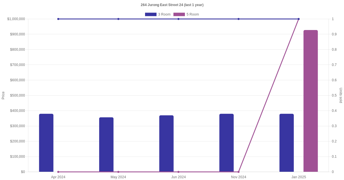 There were a total of 12 resale transactions in the last 3 years for units in block 264 Jurong East Street 24, with the latest one recorded in Aug 2025.
