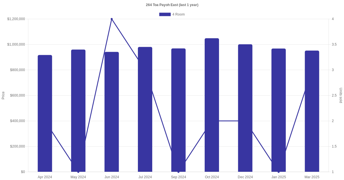 | May 2025 | $3,800 | 4 Room | Blk 264 Toa Payoh East 4 Room | Toa Payoh |