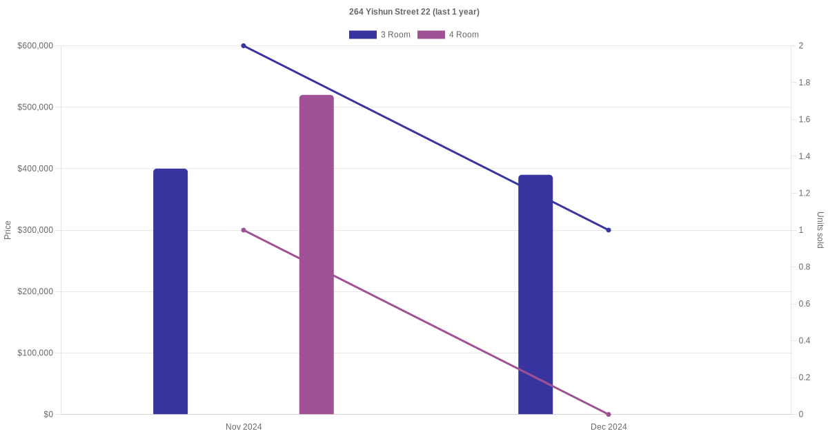 Below is a quick summary of the resale transactions volume and average price trends for the 3 room and 4 room units at 264 Yishun Street 22.