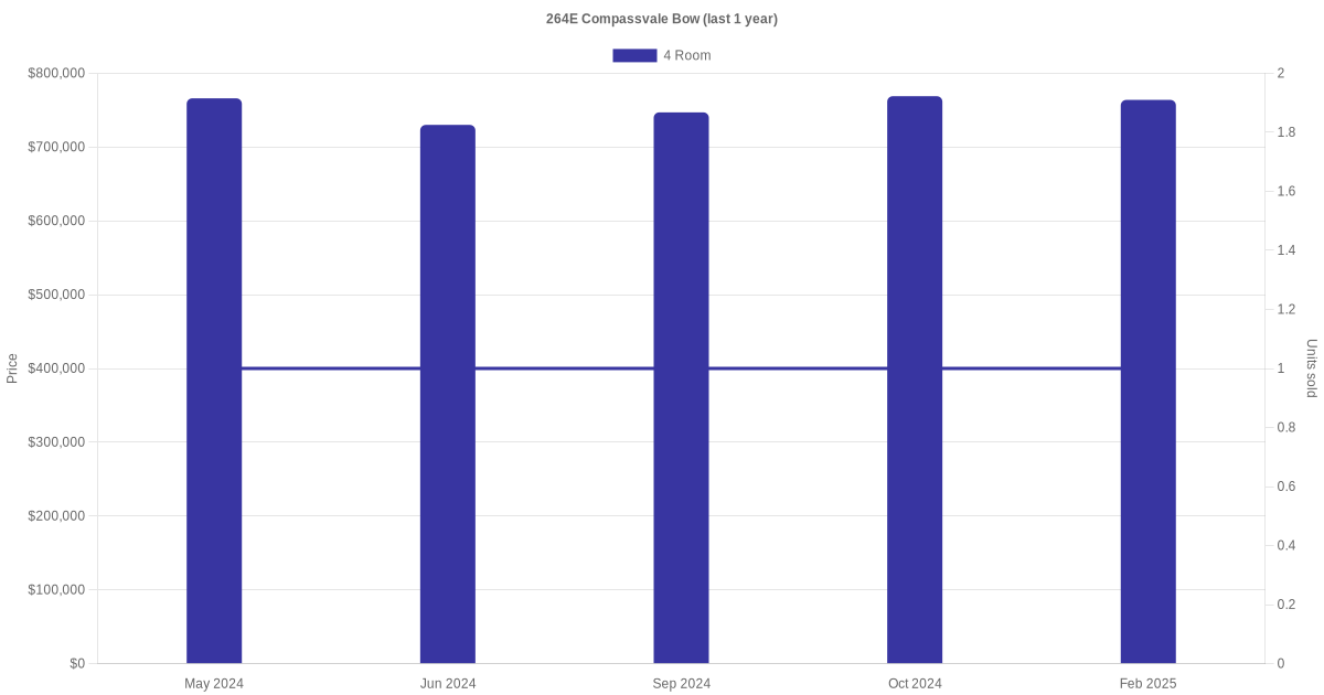 Below is a quick summary of the resale transactions volume and average price trends for the 4 room units at 264E Compassvale Bow.