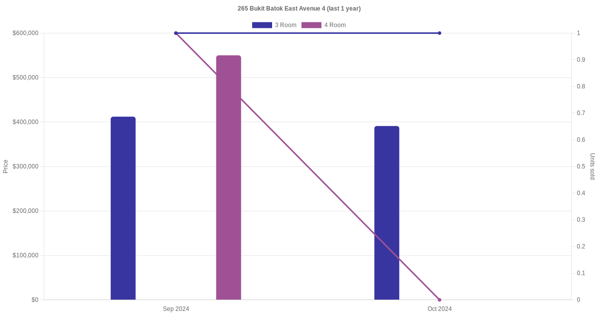 Below is a quick summary of the resale transactions volume and average price trends for the 3 room and 4 room units at 265 Bukit Batok East Avenue 4.