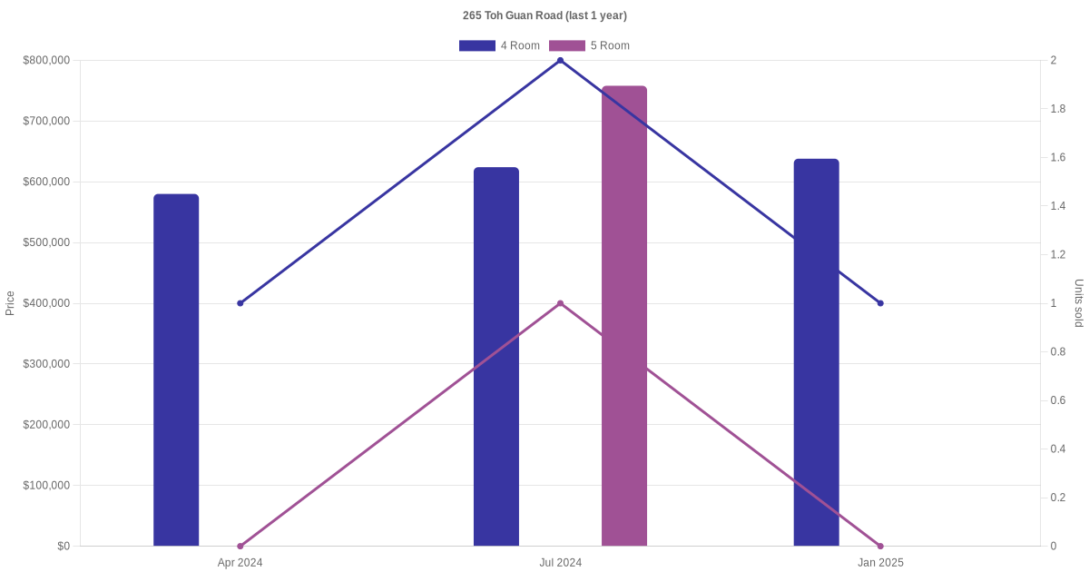 Below is a quick summary of the resale transactions volume and average price trends for the 4 room and 5 room units at 265 Toh Guan Road.