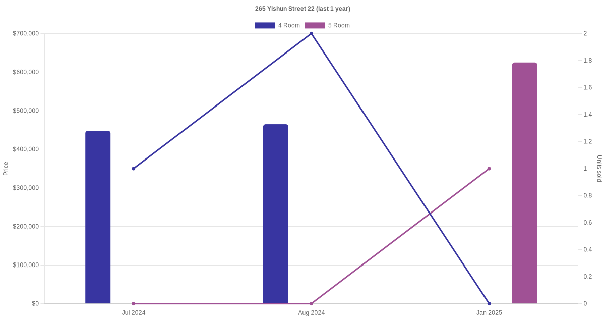 Below is a quick summary of the resale transactions volume and average price trends for the 4 room and 5 room units at 265 Yishun Street 22.
