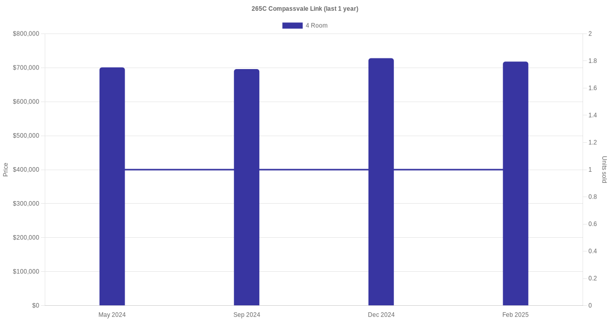 There were a total of 6 resale transactions in the last 3 years for units in block 265C Compassvale Link, with the latest one recorded in Feb 2025.
