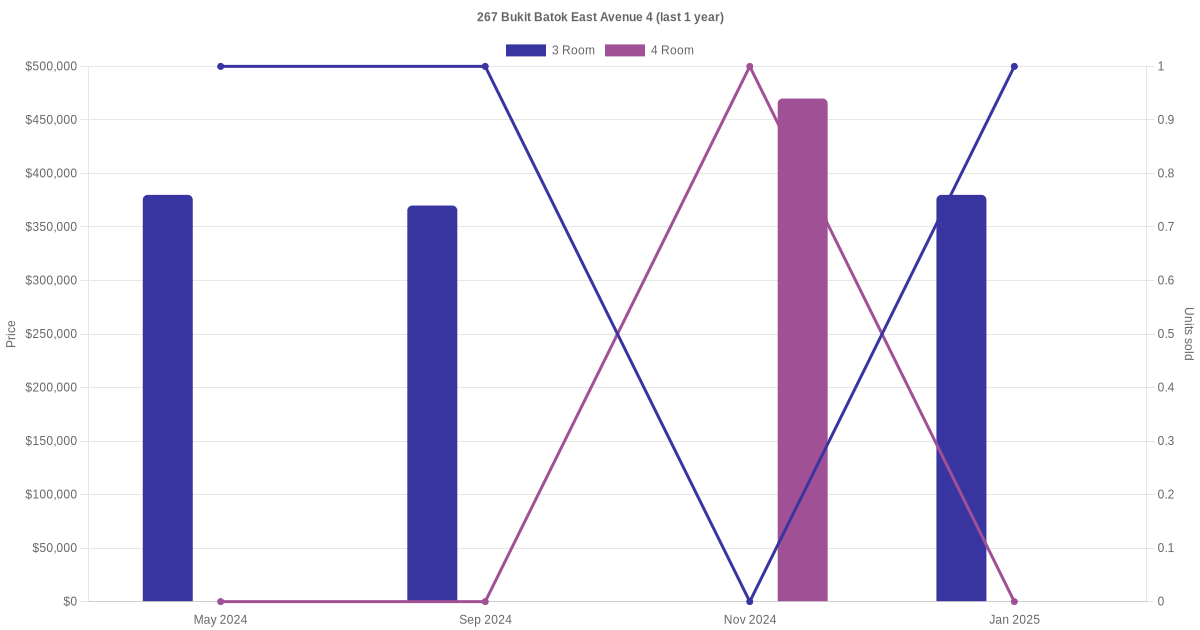 Below is a quick summary of the resale transactions volume and average price trends for the 3 room and 4 room units at 267 Bukit Batok East Avenue 4.