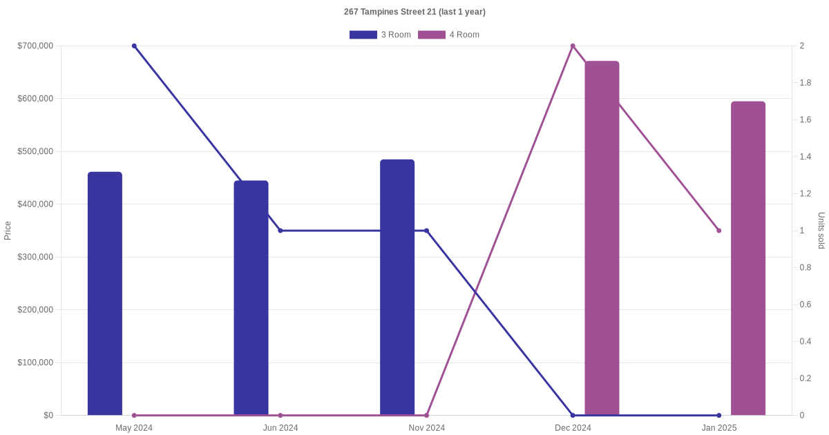 Below is a quick summary of the resale transactions volume and average price trends for the 3 room, 4 room and executive units at 267 Tampines Street 21.