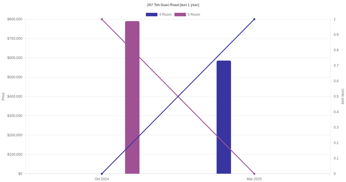 Below is a quick summary of the resale transactions volume and average price trends for the 4 room and 5 room units at 267 Toh Guan Road.