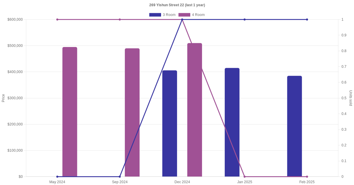Below is a quick summary of the resale transactions volume and average price trends for the 3 room, 4 room and 5 room units at 269 Yishun Street 22.