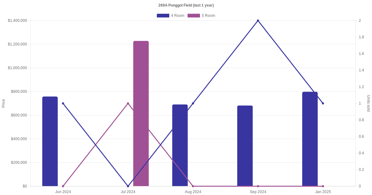 Below is a quick summary of the resale transactions volume and average price trends for the 4 room and 5 room units at 269A Punggol Field.