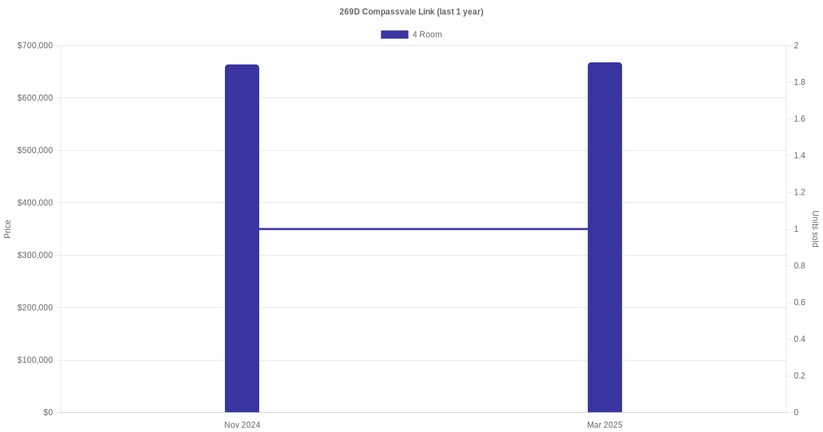 There were a total of 6 resale transactions in the last 3 years for units in block 269D Compassvale Link, with the latest one recorded in Mar 2025.
