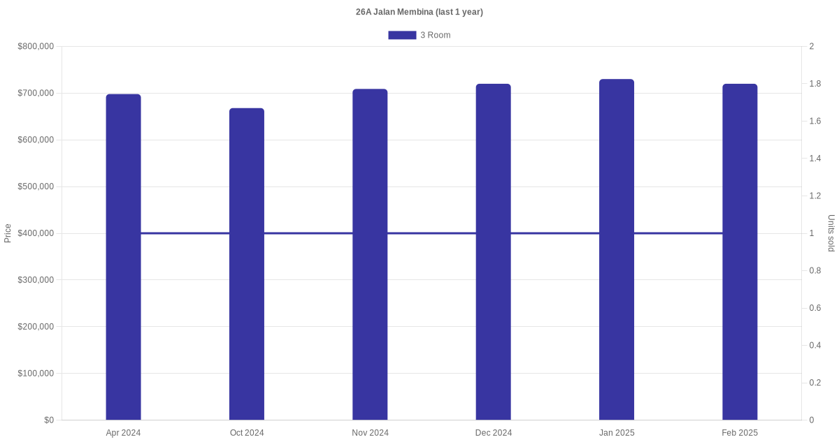 | Feb 2025 | $720,000 | $12,000 | 3 Room | Blk 26A Jalan Membina 3 Room / 60 sqm | 16 to 18 | 60 sqm | Model A | 2008 |