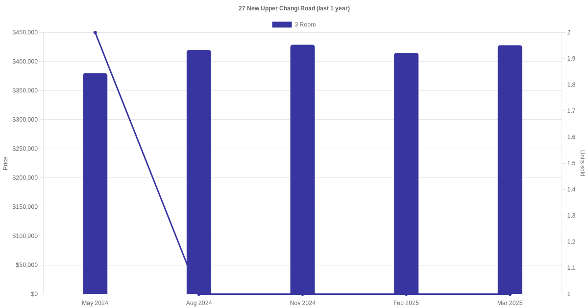 Below is a quick summary of the resale transactions volume and average price trends for the 3 room units at 27 New Upper Changi Road.