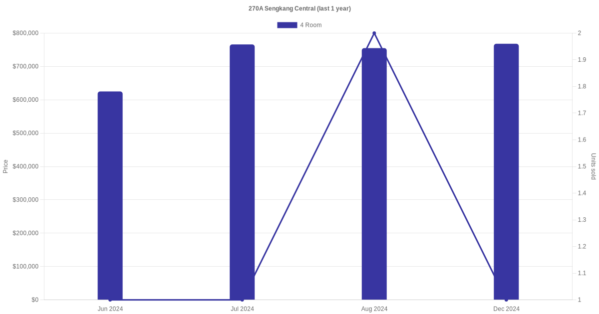 Below is a quick summary of the resale transactions volume and average price trends for the 4 room units at 270A Sengkang Central.