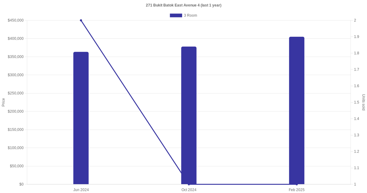 Below is a quick summary of the resale transactions volume and average price trends for the 3 room and 4 room units at 271 Bukit Batok East Avenue 4.