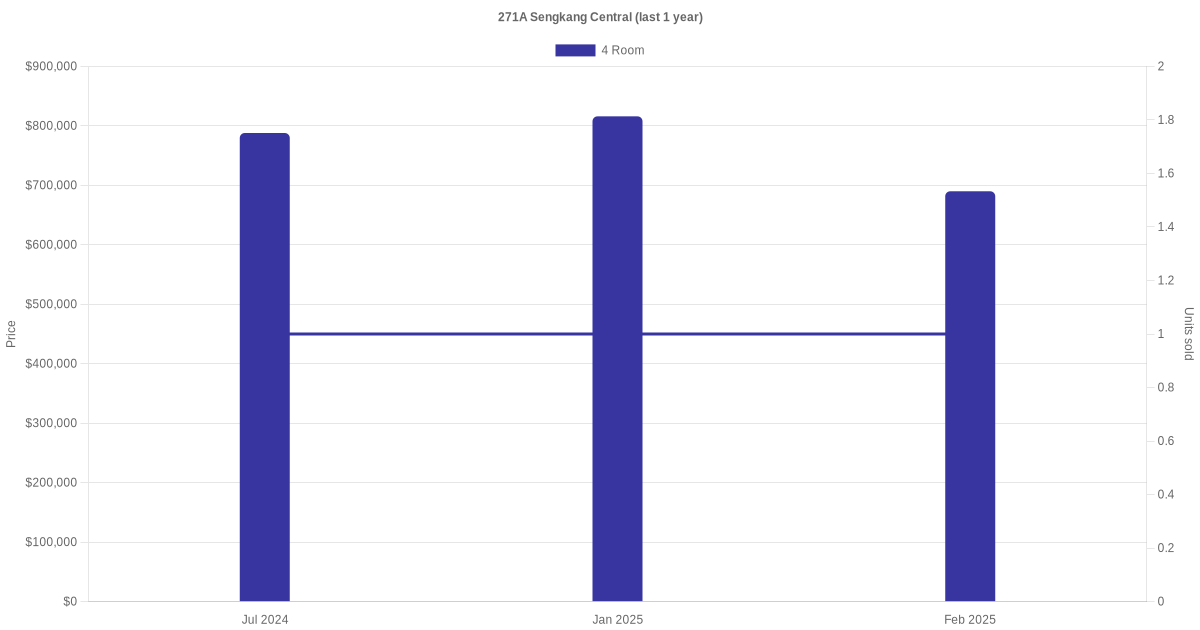 Below is a quick summary of the resale transactions volume and average price trends for the 4 room units at 271A Sengkang Central.
